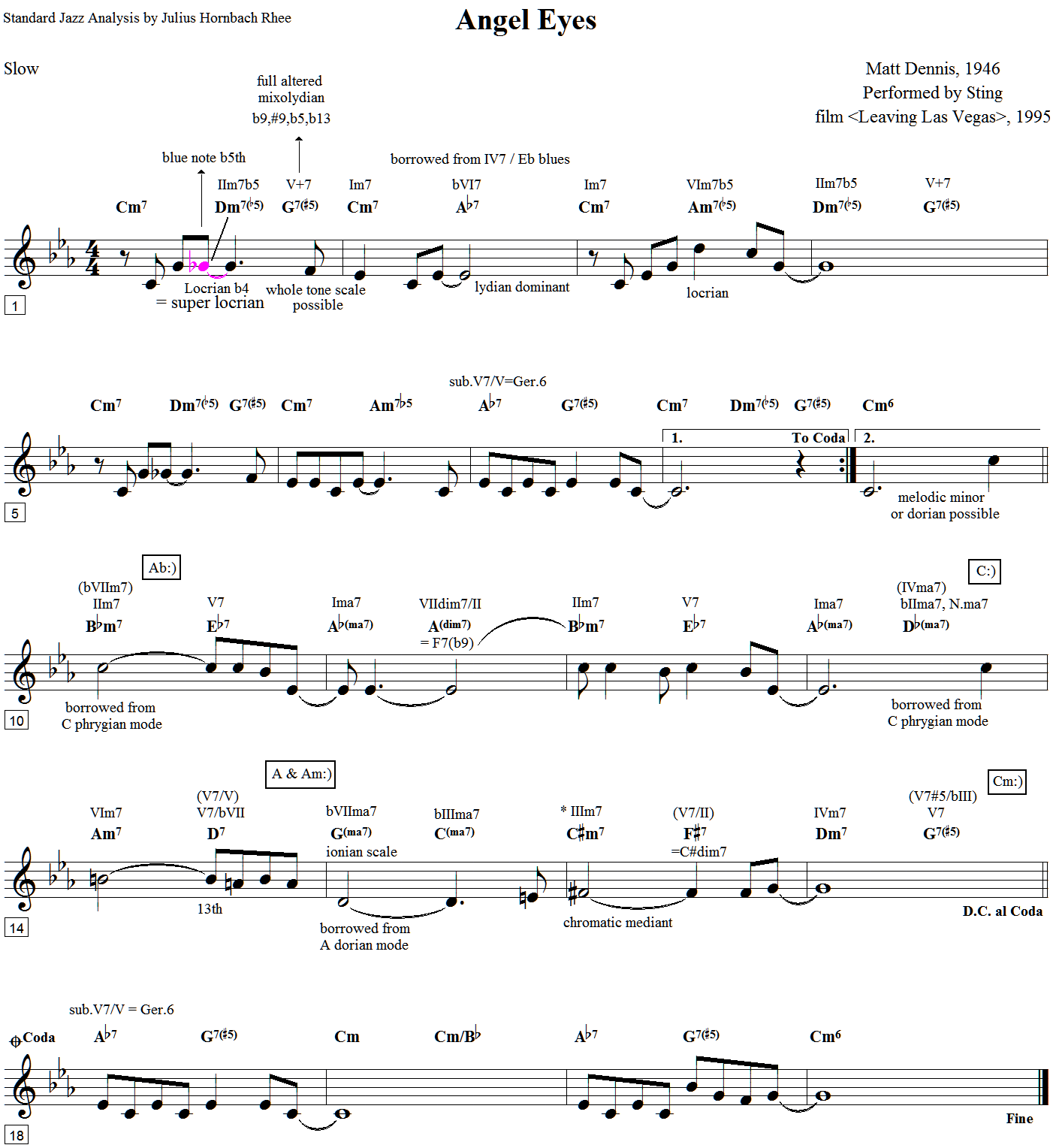 * super locrian : locrian의 4번째 음을 반음 내린 상태로서 음계(scale)에서 가장 어두운 색채를 지닌다. 이것은 blues와 직접 관련이 있으나 그 원천은 melodic minor에 있다. 즉 이 곡의 Dm7♭5는 E♭ melodic minor의 VIIm7♭5를 차용한 것이다. 또한 위 2마디의 Ab7 역시 E♭ melodic minor의 IV7을 차용한 것이다. 따라서 20세기 전후의 많은 화음들이 melodic minor로부터 파생되는 화음들을 가져다 사용하는 것이다. 이것은 흔히 modal interchange 즉 선법교체의 개념이 아니라 tonal interchange에 해당하는 것이다. tonal interchange는 전조를 하지 않고서 조성의 중심축(tonal axis)이 순간 바뀌어버리는 현상을 말한다. 한편 modal interchange는 중심축은 그대로이나 선법의 전이(轉移)현상을 말한다.